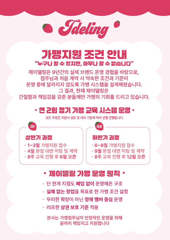 체계화된 주문 방법 등 전반적인 운영시스템을 교육하고 있으며 지속적인 관리와 적극적인 서포트를 제공합니다.